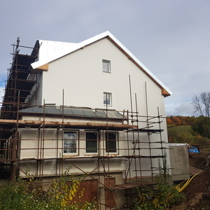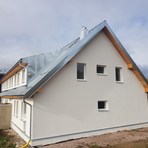 Probíhá montáž modřínového obkladu na části budovy. Tyto práce budou do zimy dokončeny a spolu s tím zmizí i lešení. Ve špatném počasí se přesouváme dovnitř a finišují se poslední příčky (k prodeji budou uvolněny byty 3.03 a 3.04). Dále probíhá montáž sádrokartonových podhledů ve 3.NP a příprava pro izolace na půdě, tak aby přes zimu mohly probíhat veškeré práce v interiéru.