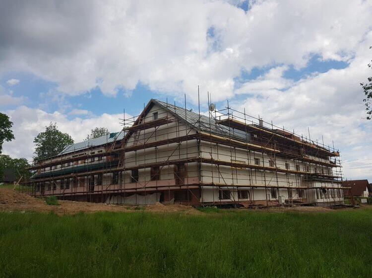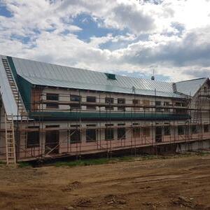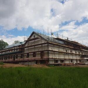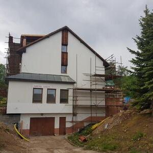 Stavba je téměř kompletně obehnána lešením, probíhá demontáž stávající střešní krytiny a postupná montáž nového plechu. Začínáme vybourávat okna a upravovat otvory pro nová. Zároveň jsme provedli základní zemní práce kolem domu a rýsují se tak první předzahrádky u budoucích bytů v přízemí.