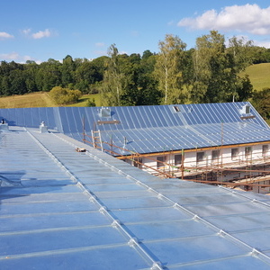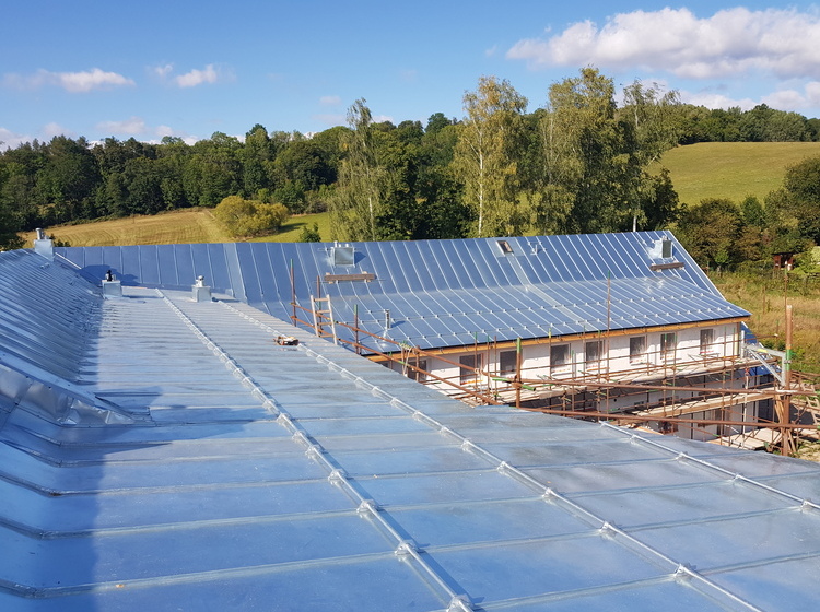 V průběhu září probíhaly práce především na střeše a fasádě. Na střeše zbývá doplnit několik drobných prvků. Postupně rozebíráme lešení a je tak vidět první část dokončené fasády- východní štít budovy. Dokončení zbytku fasády a střechy předpokládáme během října. Od listopadu se pak přesuneme pod střechu a začne realizace podlah a omítek.